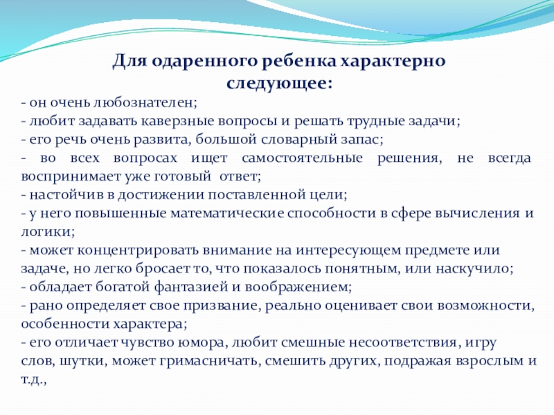 Для одаренного ребенка характерно следующее:- он очень любознателен;- любит задавать каверзные вопросы и решать трудные задачи;- его