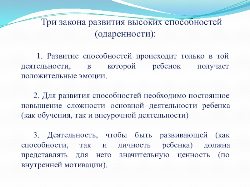 Слайд 6Три закона развития высоких способностей (одаренности):