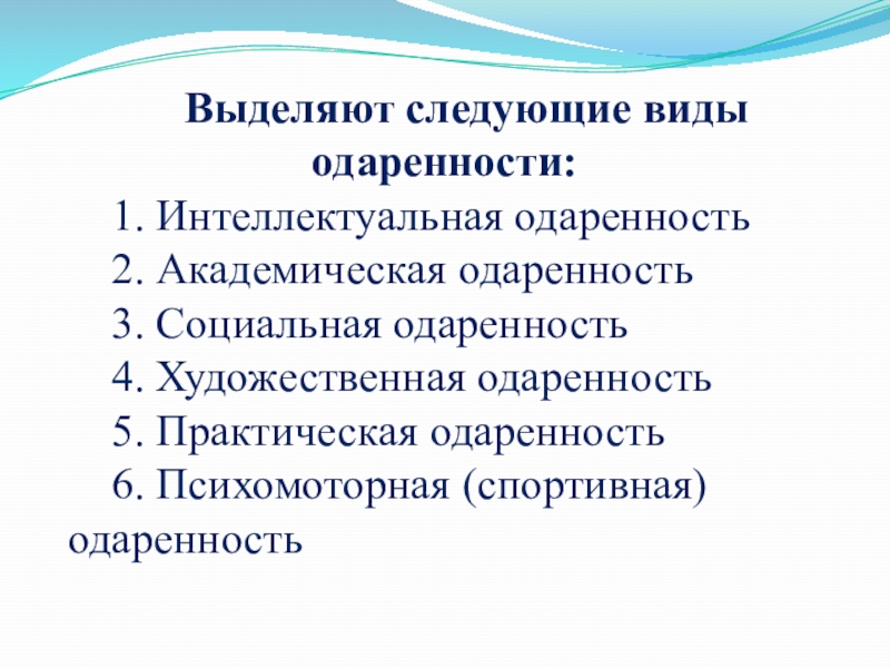 Выделяют следующие виды одаренности: 1. Интеллектуальная одаренность 2. Академическая одаренность 3. Социальная одаренность 4. Художественная одаренность 5.