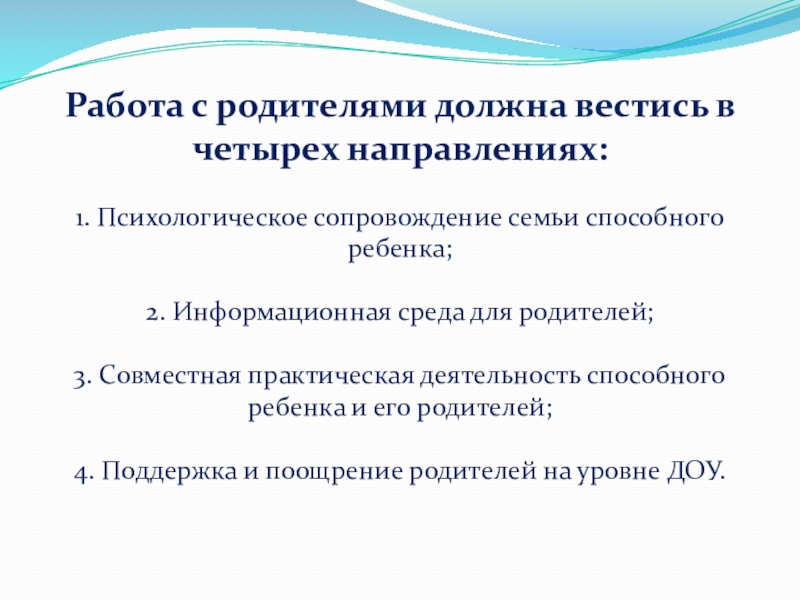 Работа с родителями должна вестись в четырех направлениях:  1. Психологическое сопровождение семьи способного ребенка;  2. Информационная среда