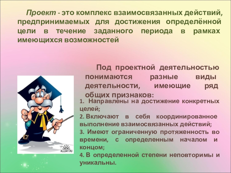 Под проектной деятельностью понимаются разные виды деятельности, имеющие ряд общих признаков:
