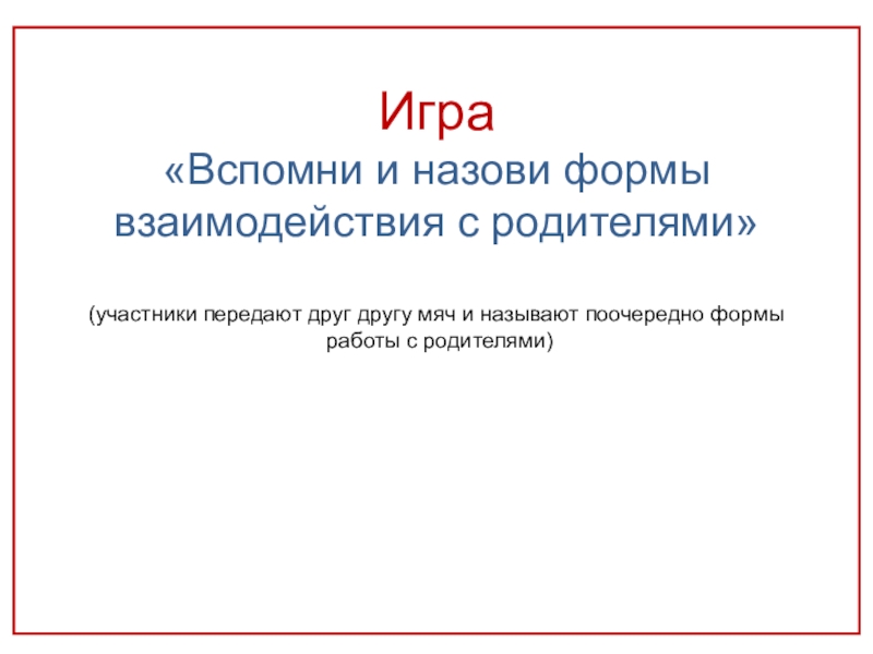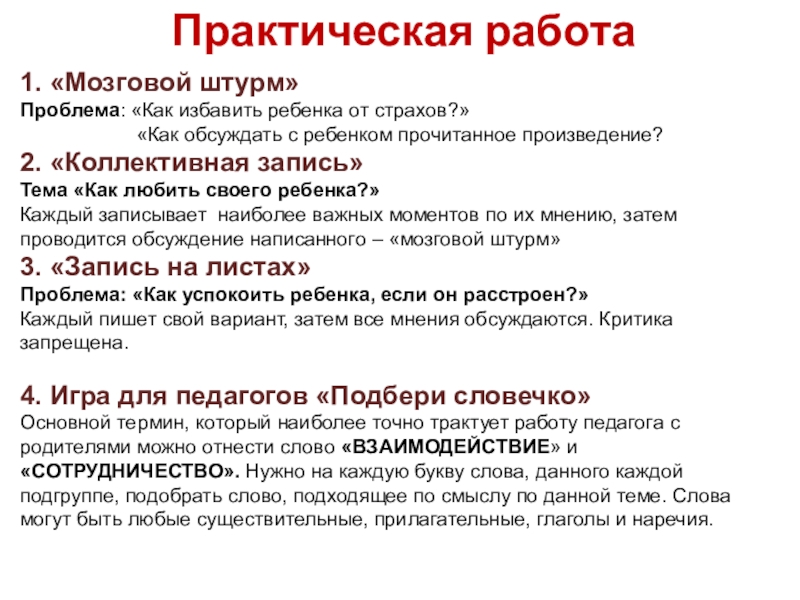Основной термин, который наиболее точно трактует работу педагога с родителями можно отнести слово «ВЗАИМОДЕЙСТВИЕ» и «СОТРУДНИЧЕСТВО». Нужно на каждую букву слова, данного каждой подгруппе, подобрать слово, подходящее по смыслу по данной теме. Слова могут быть любые существительные, прилагательные, глаголы и наречия.
