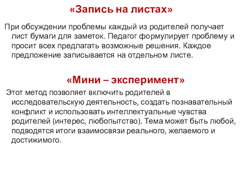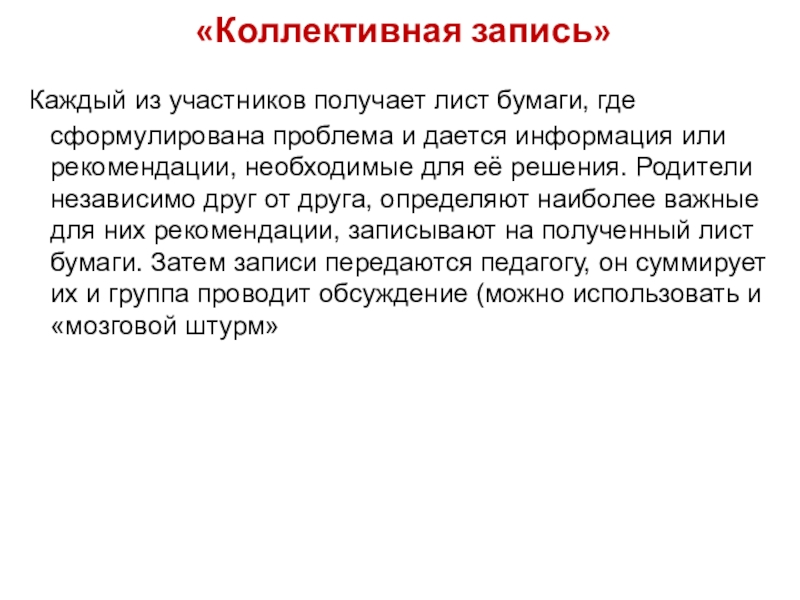 дается информация или рекомендации, необходимые для её решения. Родители независимо друг от друга, определяют наиболее важные для них рекомендации, записывают на полученный лист бумаги. Затем записи передаются педагогу, он суммирует их и группа проводит обсуждение (можно использовать и «мозговой штурм»
