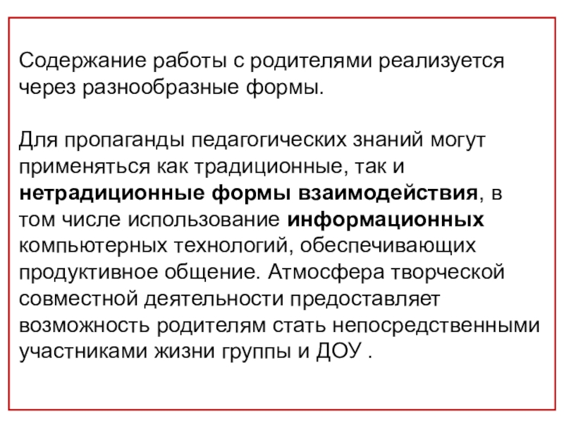 знаний могут применяться как традиционные, так и нетрадиционные формы взаимодействия, в том числе использование информационных компьютерных технологий, обеспечивающих продуктивное общение. Атмосфера творческой совместной деятельности предоставляет возможность родителям стать непосредственными участниками жизни группы и ДОУ .