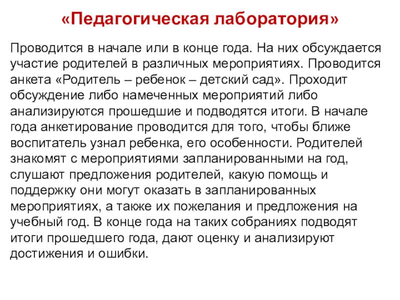 них обсуждается участие родителей в различных мероприятиях. Проводится анкета «Родитель – ребенок – детский сад». Проходит обсуждение либо намеченных мероприятий либо анализируются прошедшие и подводятся итоги. В начале года анкетирование проводится для того, чтобы ближе воспитатель узнал ребенка, его особенности. Родителей знакомят с мероприятиями запланированными на год, слушают предложения родителей, какую помощь и поддержку они могут оказать в запланированных мероприятиях, а также их пожелания и предложения на учебный год. В конце года на таких собраниях подводят итоги прошедшего года, дают оценку и анализируют достижения и ошибки.
