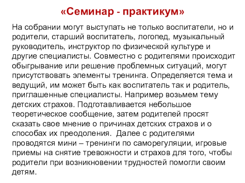 но и родители, старший воспитатель, логопед, музыкальный руководитель, инструктор по физической культуре и другие специалисты. Совместно с родителями происходит обыгрывание или решение проблемных ситуаций, могут присутствовать элементы тренинга. Определяется тема и ведущий, им может быть как воспитатель так и родитель, приглашенные специалисты. Например возьмем тему детских страхов. Подготавливается небольшое теоретическое сообщение, затем родителей просят сказать свое мнение о причинах детских страхов и о способах их преодоления. Далее с родителями проводятся мини – тренинги по саморегуляции, игровые приемы на снятие тревожности и страхов для того, чтобы родители при возникновении трудностей помогли своим детям.