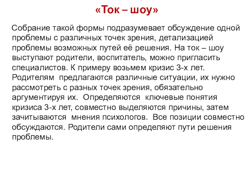 с различных точек зрения, детализацией проблемы возможных путей её решения. На ток – шоу выступают родители, воспитатель, можно пригласить специалистов. К примеру возьмем кризис 3-х лет. Родителям предлагаются различные ситуации, их нужно рассмотреть с разных точек зрения, обязательно аргументируя их. Определяются ключевые понятия кризиса 3-х лет, совместно выделяются причины, затем зачитываются мнения психологов. Все позиции совместно обсуждаются. Родители сами определяют пути решения проблемы.