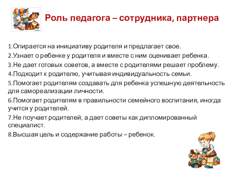 7.Не поучает родителей, а дает советы как дипломированный специалист.