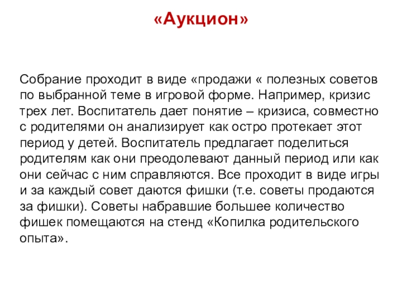 выбранной теме в игровой форме. Например, кризис трех лет. Воспитатель дает понятие – кризиса, совместно с родителями он анализирует как остро протекает этот период у детей. Воспитатель предлагает поделиться родителям как они преодолевают данный период или как они сейчас с ним справляются. Все проходит в виде игры и за каждый совет даются фишки (т.е. советы продаются за фишки). Советы набравшие большее количество фишек помещаются на стенд «Копилка родительского опыта».