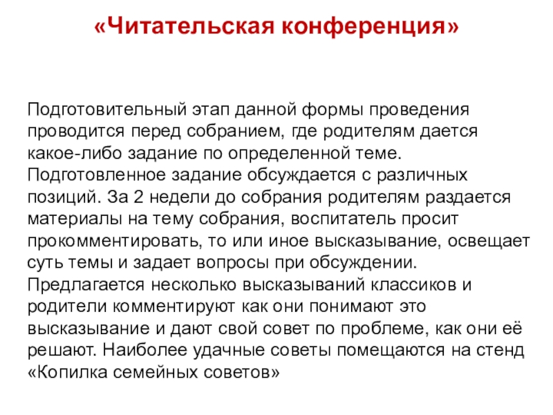 где родителям дается какое-либо задание по определенной теме. Подготовленное задание обсуждается с различных позиций. За 2 недели до собрания родителям раздается материалы на тему собрания, воспитатель просит прокомментировать, то или иное высказывание, освещает суть темы и задает вопросы при обсуждении. Предлагается несколько высказываний классиков и родители комментируют как они понимают это высказывание и дают свой совет по проблеме, как они её решают. Наиболее удачные советы помещаются на стенд «Копилка семейных советов»