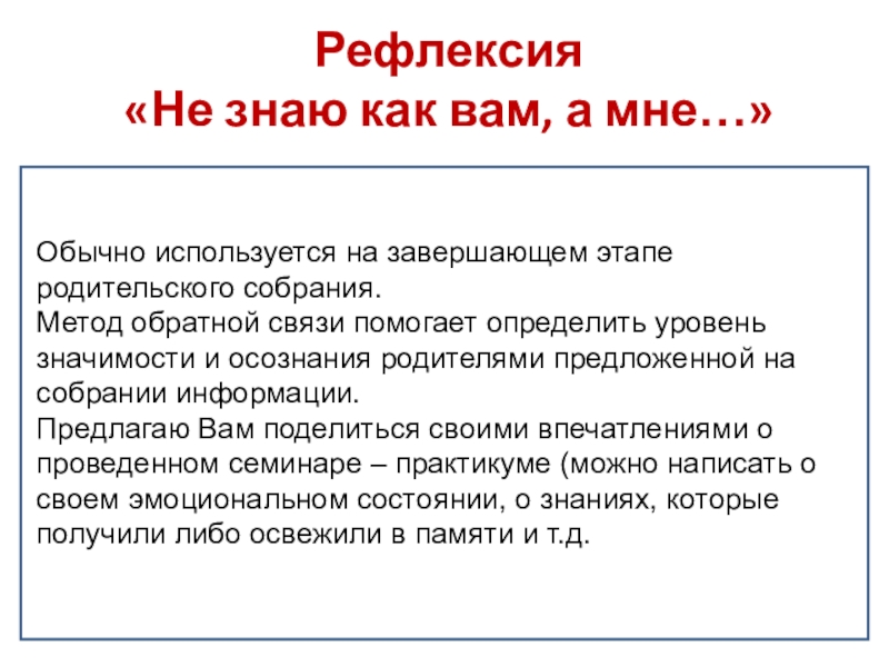 Метод обратной связи помогает определить уровень значимости и осознания родителями предложенной на собрании информации.
