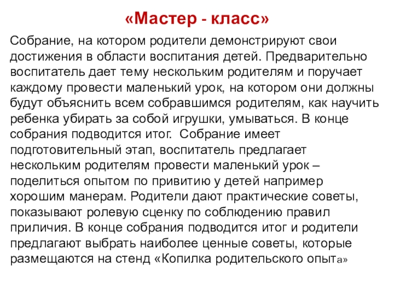в области воспитания детей. Предварительно воспитатель дает тему нескольким родителям и поручает каждому провести маленький урок, на котором они должны будут объяснить всем собравшимся родителям, как научить ребенка убирать за собой игрушки, умываться. В конце собрания подводится итог. Собрание имеет подготовительный этап, воспитатель предлагает нескольким родителям провести маленький урок – поделиться опытом по привитию у детей например хорошим манерам. Родители дают практические советы, показывают ролевую сценку по соблюдению правил приличия. В конце собрания подводится итог и родители предлагают выбрать наиболее ценные советы, которые размещаются на стенд «Копилка родительского опыта»