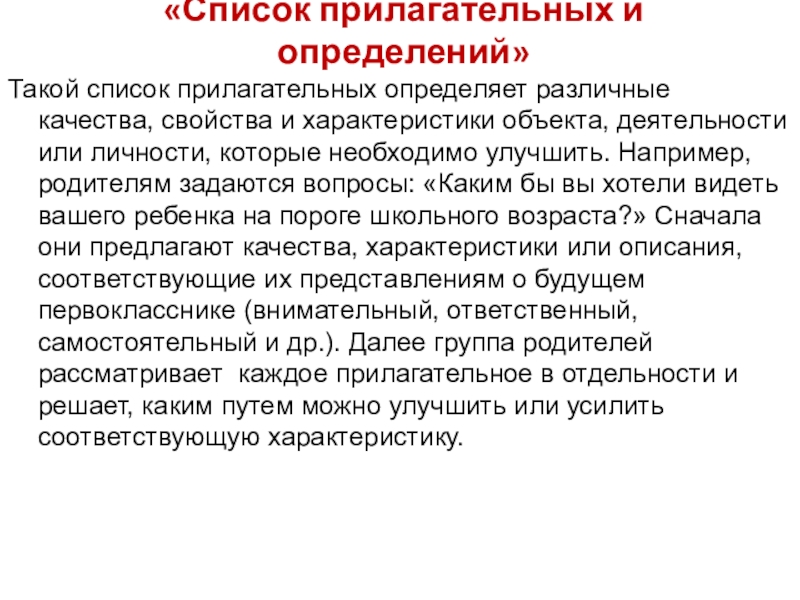 характеристики объекта, деятельности или личности, которые необходимо улучшить. Например, родителям задаются вопросы: «Каким бы вы хотели видеть вашего ребенка на пороге школьного возраста?» Сначала они предлагают качества, характеристики или описания, соответствующие их представлениям о будущем первокласснике (внимательный, ответственный, самостоятельный и др.). Далее группа родителей рассматривает каждое прилагательное в отдельности и решает, каким путем можно улучшить или усилить соответствующую характеристику.