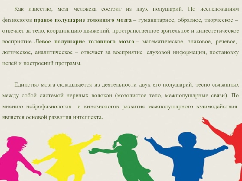 Единство мозга складывается из деятельности двух его полушарий, тесно связанных между собой системой нервных волокон (мозолистое тело, межполушарные связи). По мнению нейрофизиологов и кинезиологов развитие межполушарного взаимодействия является основой развития интеллекта.