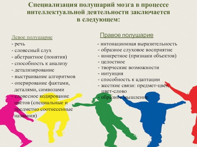 Слайд 9Специализация полушарий мозга в процессе интеллектуальной деятельности заключается