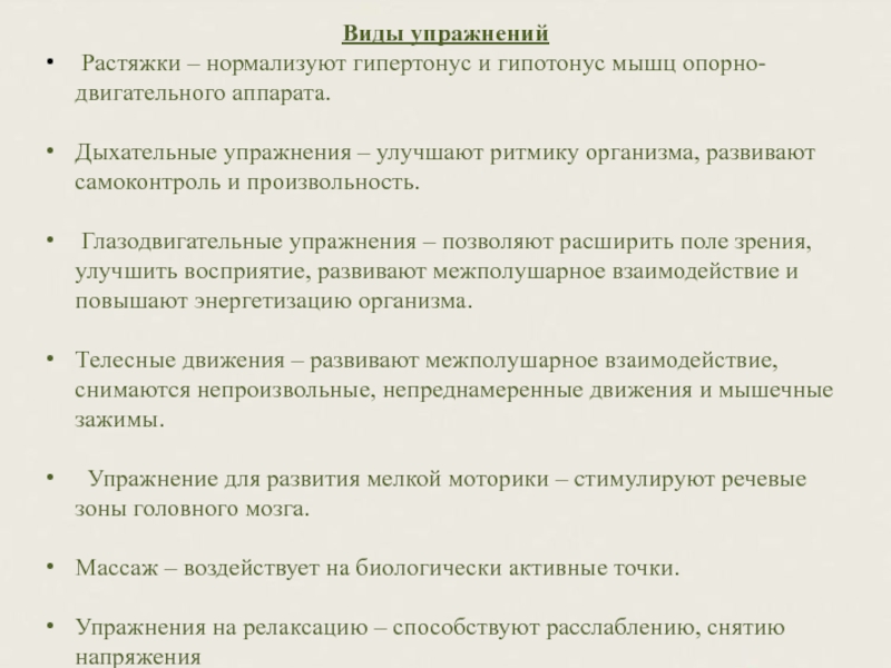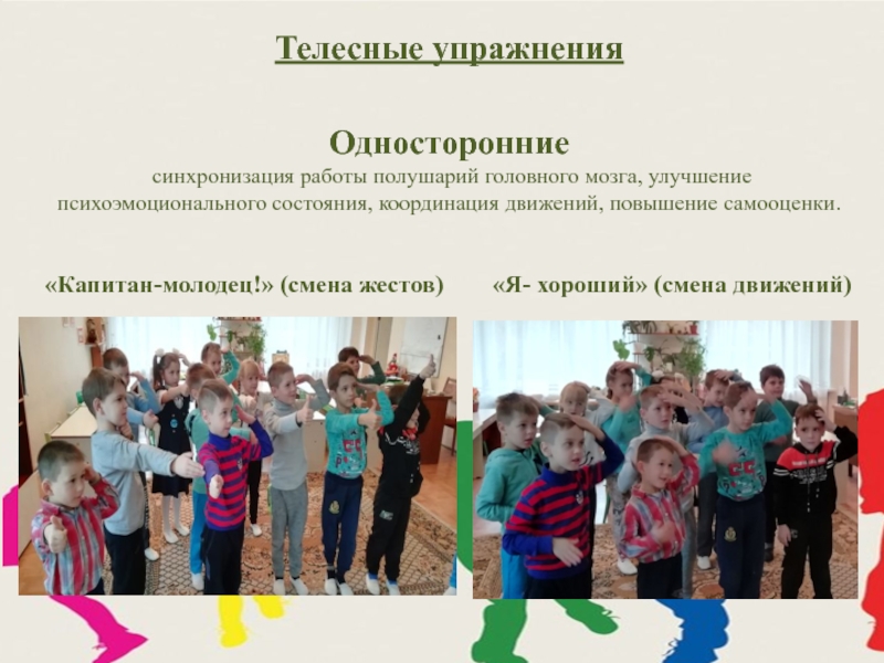 Телесные движения – развивают межполушарное взаимодействие, снимаются непроизвольные, непреднамеренные движения и мышечные зажимы.