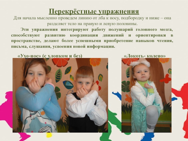 Эти упражнения интегрируют работу полушарий головного мозга, способствуют развитию координации движений и ориентировки в пространстве, делают более успешными приобретение навыков чтения, письма, слушания, усвоения новой информации.