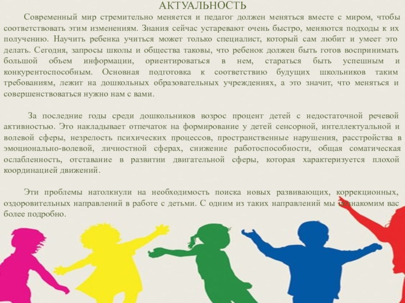 Эти проблемы натолкнули на необходимость поиска новых развивающих, коррекционных, оздоровительных направлений в работе с детьми. С одним из таких направлений мы познакомим вас более подробно.