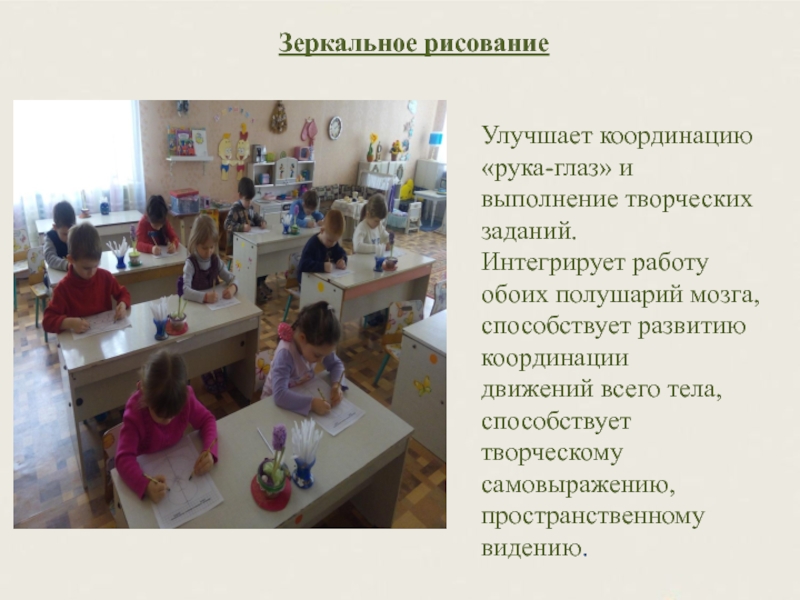 развивают межполушарное взаимодействие (мозолистое тело, произвольность и самоконтроль, стимулируют работу речевых центров)