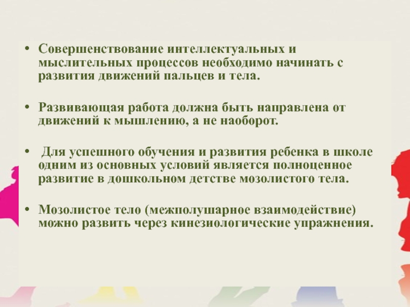 Слайд 27Совершенствование интеллектуальных и мыслительных процессов необходимо начинать с развития движений пальцев