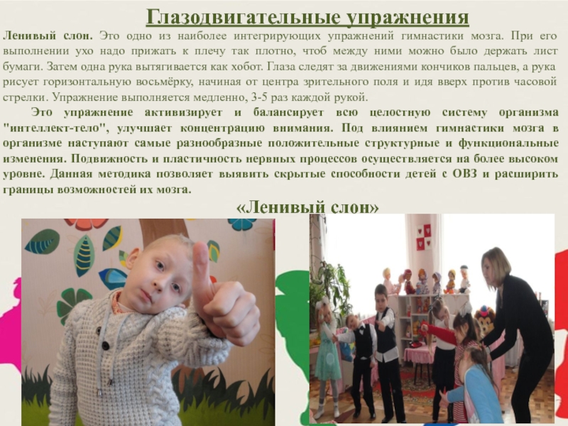 Это упражнение активизирует и балансирует всю целостную систему организма "интеллект-тело", улучшает концентрацию внимания. Под влиянием гимнастики мозга в организме наступают самые разнообразные положительные структурные и функциональные изменения. Подвижность и пластичность нервных процессов осуществляется на более высоком уровне. Данная методика позволяет выявить скрытые способности детей с ОВЗ и расширить границы возможностей их мозга.