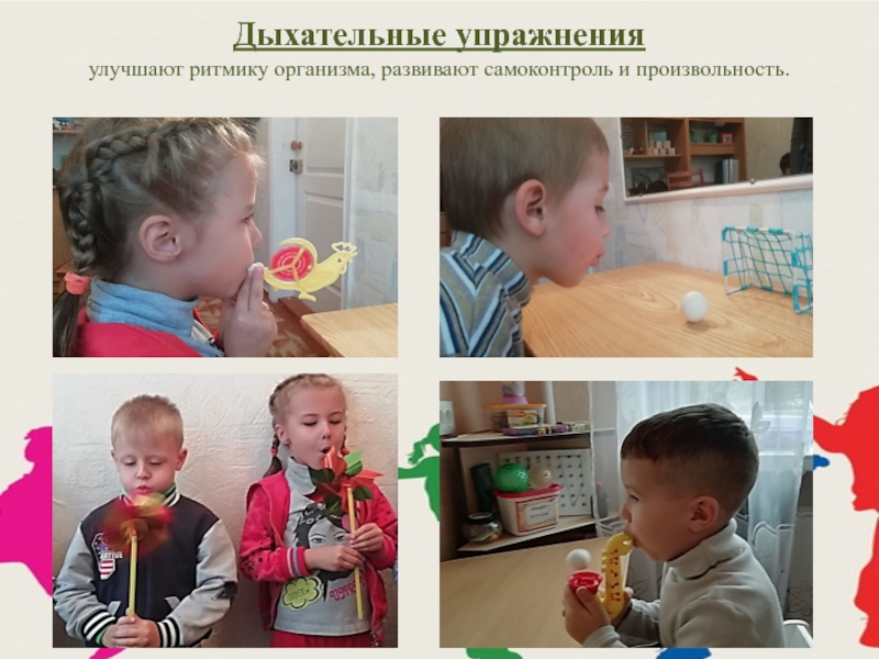 Дыхательные упражнения – улучшают ритмику организма, развивают самоконтроль и произвольность.
