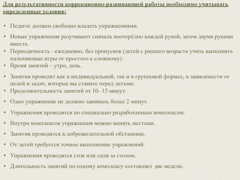 Слайд 12Для результативности коррекционно-развивающей работы необходимо учитывать определенные условия: