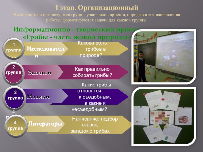 Выбираются и организуются группы участников проекта, определяются направления работы, формулируются задачи для каждой группы.