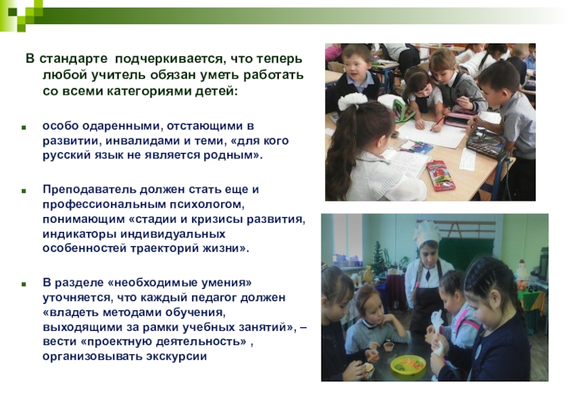 В стандарте подчеркивается, что теперь любой учитель обязан уметь работать со всеми категориями детей: особо одаренными,