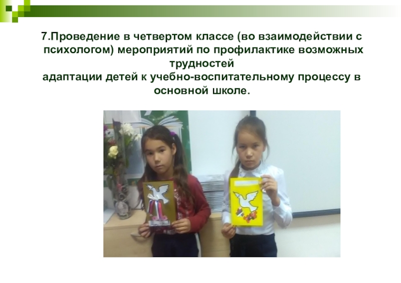 7.Проведение в четвертом классе (во взаимодействии с психологом) мероприятий по профилактике возможных трудностей адаптации детей к учебно-воспитательному