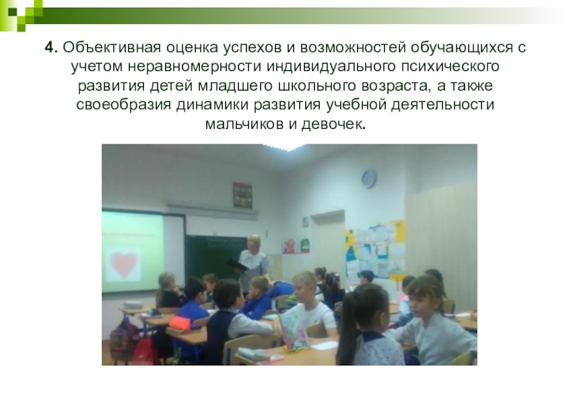 4. Объективная оценка успехов и возможностей обучающихся с учетом неравномерности индивидуального психического развития детей младшего школьного возраста,