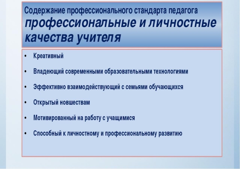 Профстандарт педагога – это перечень требований, определяющих квалификацию учителя, необходимую для качественного выполнения возложенных на него обязанностей. Новые требования предъявляются к профессиональным знаниям, профессиональным умениям и навыкам, опыту работы.