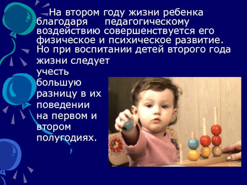 Слайд 8 На втором году жизни ребенка благодаря педагогическому воздействию