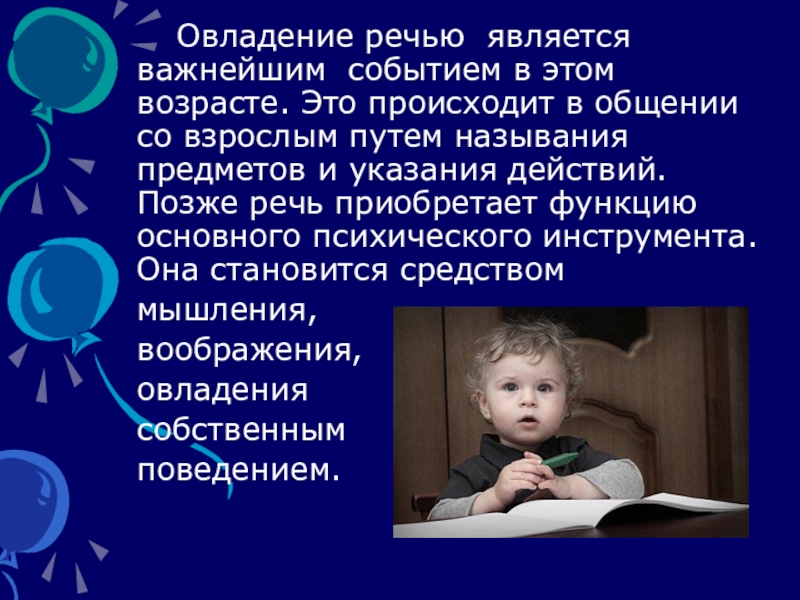 общении со взрослым путем называния предметов и указания действий. Позже речь приобретает функцию основного психического инструмента. Она становится средством