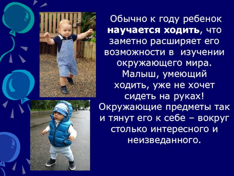 Слайд 4 Обычно к году ребенок научается ходить, что заметно расширяет его