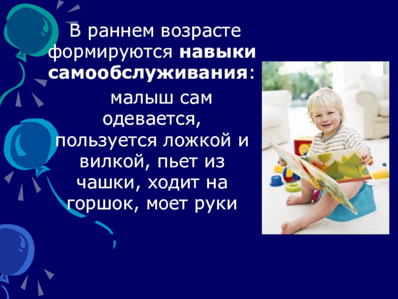 Слайд 7 В раннем возрасте формируются навыки самообслуживания: