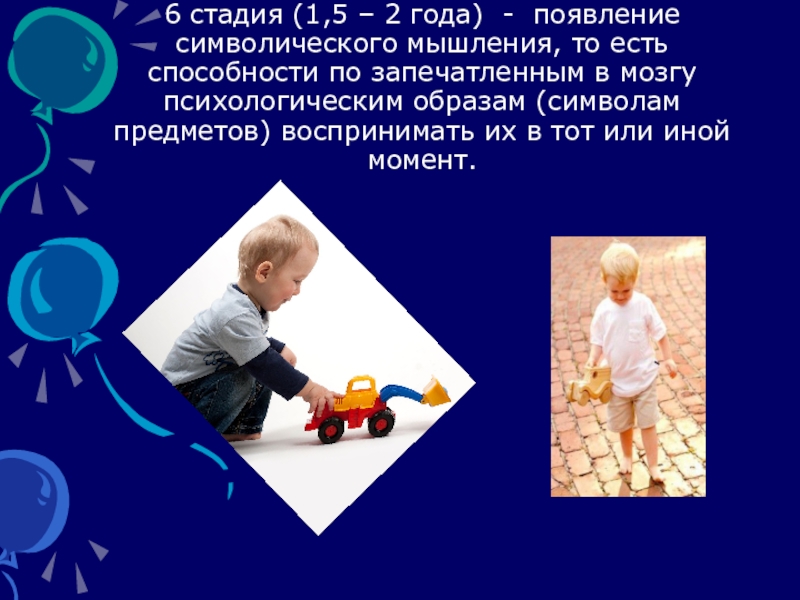 Слайд 186 стадия (1,5 – 2 года) - появление символического мышления, то