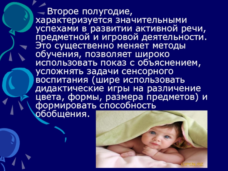 Слайд 12 Второе полугодие, характеризуется значительными успехами в развитии активной речи, предметной и игровой
