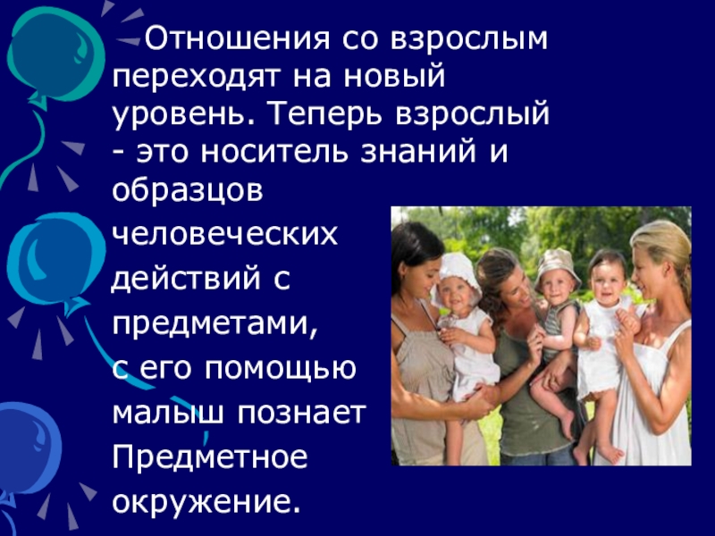 Слайд 5 Отношения со взрослым переходят на новый уровень. Теперь взрослый