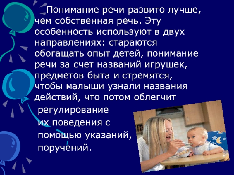 Слайд 10 Понимание речи развито лучше, чем собственная речь. Эту особенность используют в