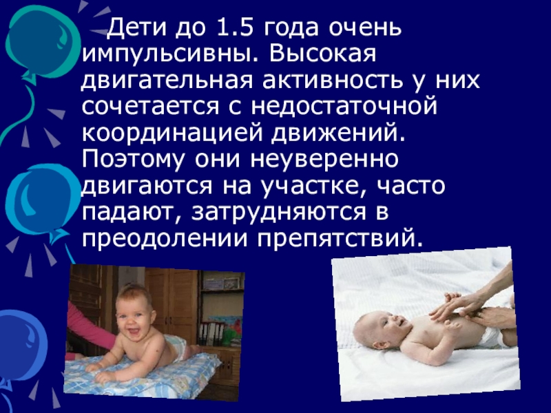 Слайд 9 Дети до 1.5 года очень импульсивны. Высокая двигательная активность