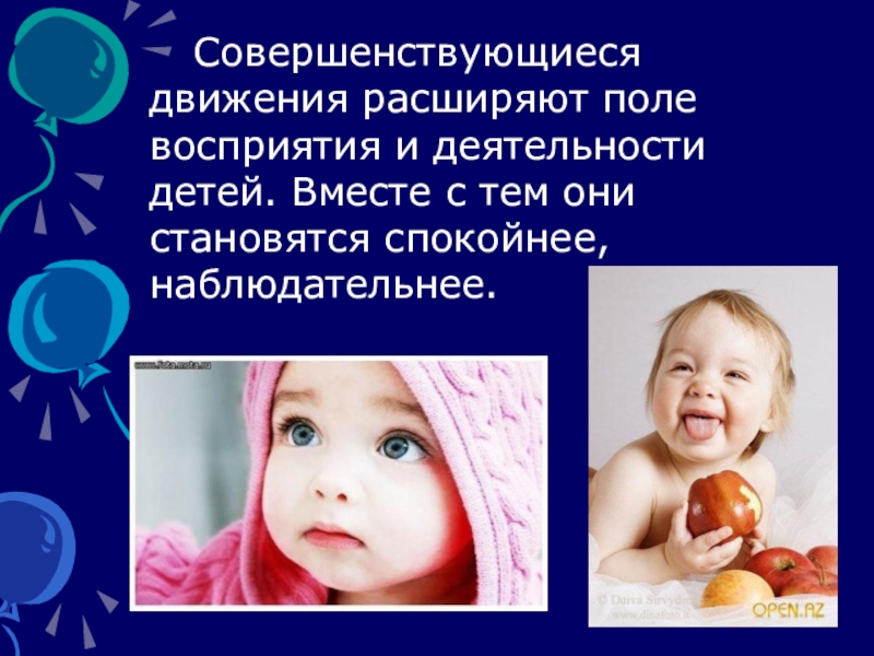 Слайд 14 Совершенствующиеся движения расширяют поле восприятия и деятельности детей. Вместе с тем
