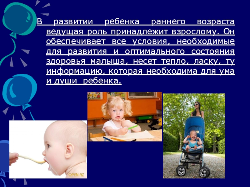 В развитии ребенка раннего возраста ведущая роль принадлежит взрослому. Он обеспечивает
