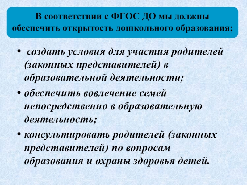 создать условия для участия родителей (законных представителей) в образовательной деятельности;