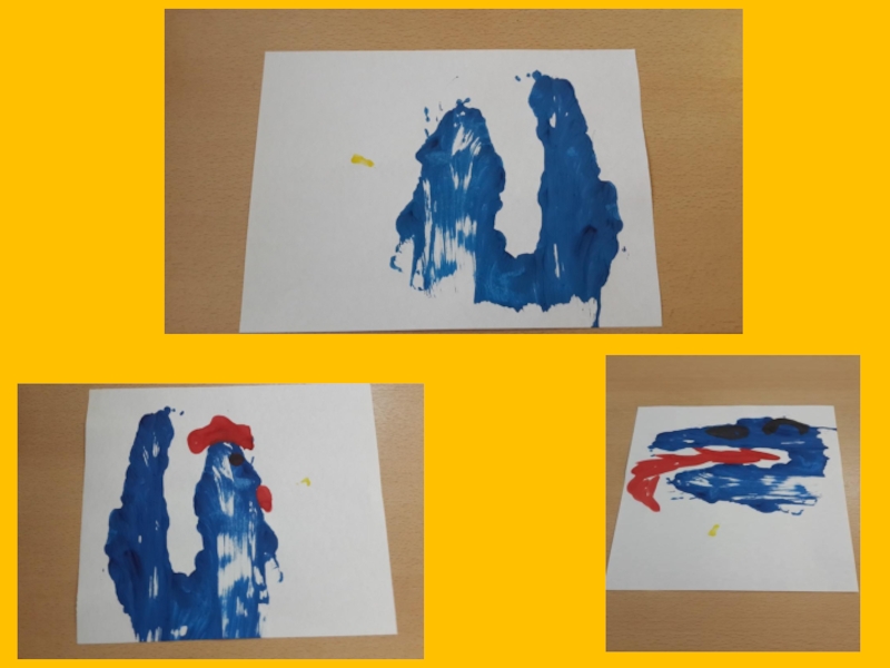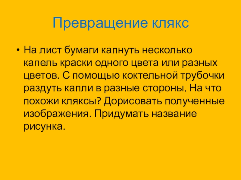 разных цветов. С помощью коктельной трубочки раздуть капли в разные стороны. На что похожи кляксы? Дорисовать полученные изображения. Придумать название рисунка.