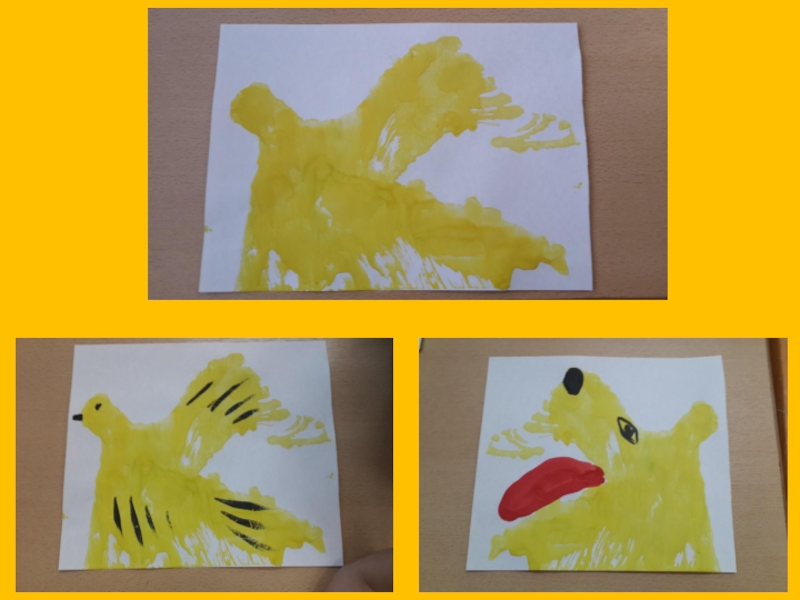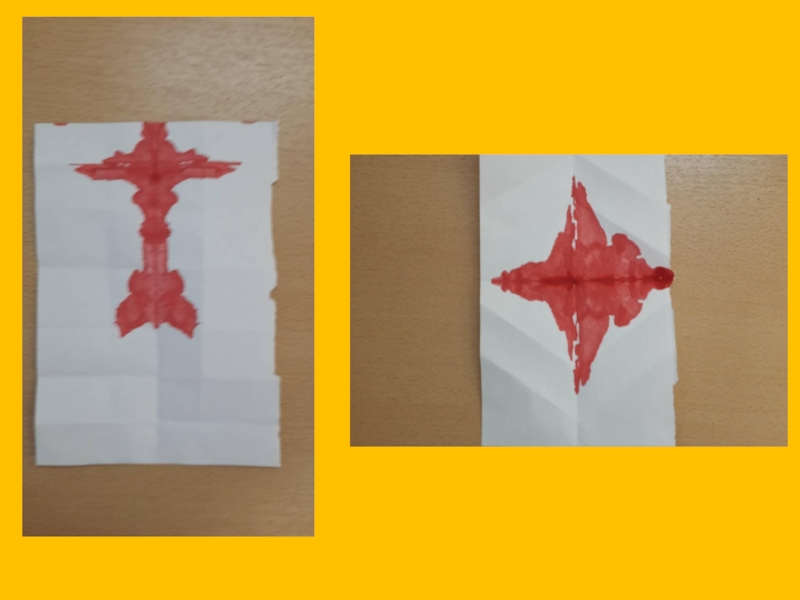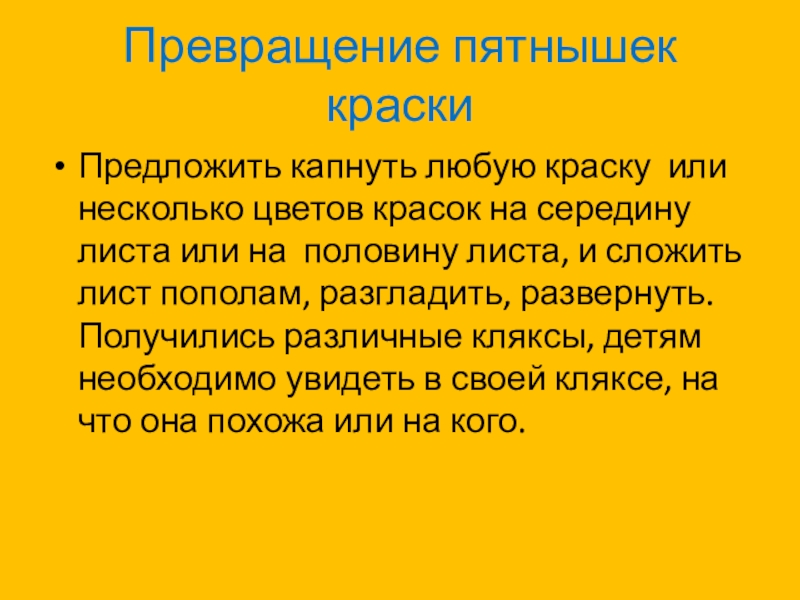 середину листа или на половину листа, и сложить лист пополам, разгладить, развернуть. Получились различные кляксы, детям необходимо увидеть в своей кляксе, на что она похожа или на кого.