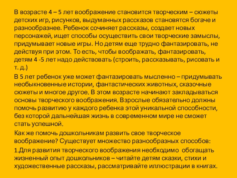 Слайд 4В возрасте 4 – 5 лет воображение становится творческим – сюжеты