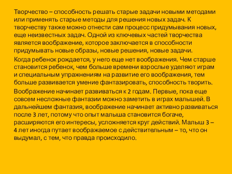 методы для решения новых задач. К творчеству также можно отнести сам процесс придумывания новых, еще неизвестных задач. Одной из ключевых частей творчества является воображение, которое заключается в способности придумывать новые образы, новые решения, новые задачи.