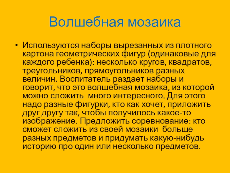 каждого ребенка): несколько кругов, квадратов, треугольников, прямоугольников разных величин. Воспитатель раздает наборы и говорит, что это волшебная мозаика, из которой можно сложить много интересного. Для этого надо разные фигурки, кто как хочет, приложить друг другу так, чтобы получилось какое-то изображение. Предложить соревнование: кто сможет сложить из своей мозаики больше разных предметов и придумать какую-нибудь историю про один или несколько предметов.