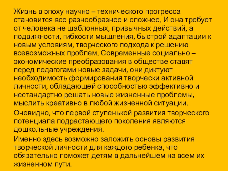 сложнее. И она требует от человека не шаблонных, привычных действий, а подвижности, гибкости мышления, быстрой адаптации к новым условиям, творческого подхода к решению всевозможных проблем. Современные социально – экономические преобразования в обществе ставят перед педагогами новые задачи, они диктуют необходимость формирования творчески активной личности, обладающей способностью эффективно и нестандартно решать новые жизненные проблемы, мыслить креативно в любой жизненной ситуации.